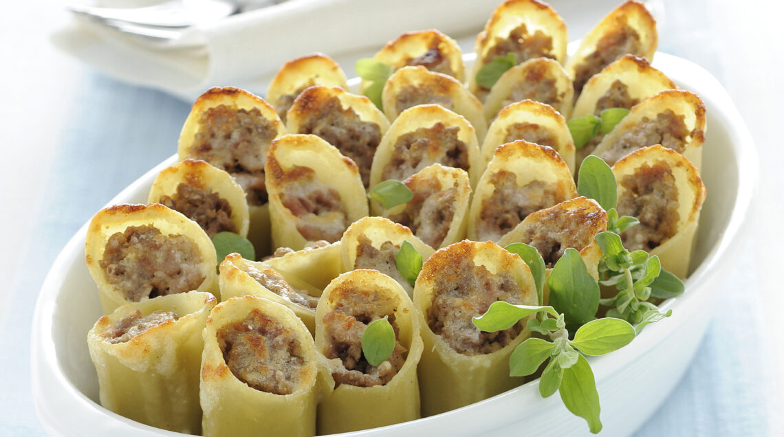 Un primo per le feste, la pasta ripiena con carne e prosciutto, profumata al brandy e infornata con panna ed erbe aromatiche. Un piatto che si prepara anche in anticipo