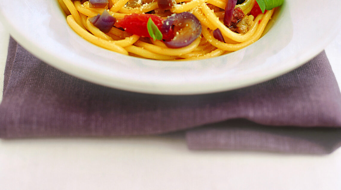 1) Per realizzare la ricetta dei bucatini al ragù vegetale inizia dalla preparazione delle verdure. Lava e asciuga le melanzane, poi togli il picciolo. Tagliale a tocchetti piuttosto irregolari e disponili su un tagliere inclinato. Salale uniformemente e lasciale spurgare per circa mezz’ora: in questo modo eliminerai l’amaro. Trascorso questo tempo sciacquale, strizzale e appoggiale su un canovaccio pulito.