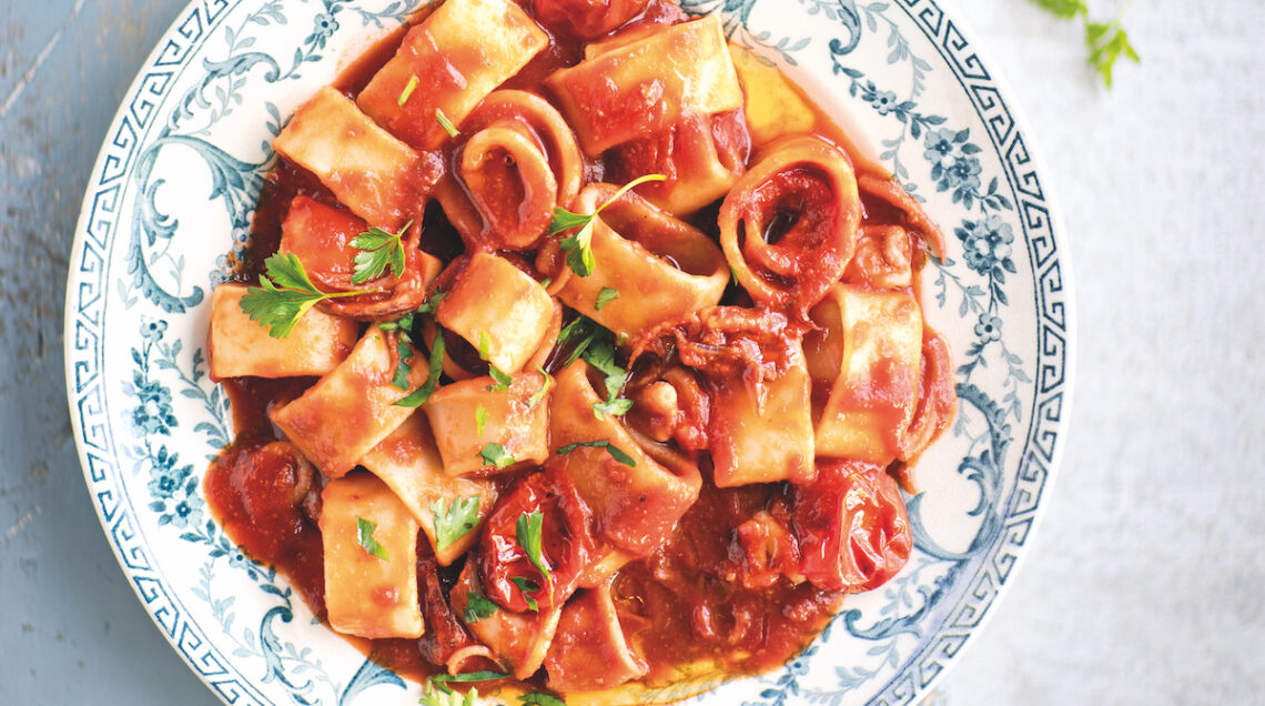 Un formato di pasta speciale che prende il nome dal mollusco tagliato ad anelli con cui è abbinata. Con sughetto di pomodoro al peperoncino