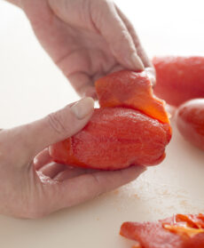Scottate i pomodori in acqua bollente, sgocciolateli e raffreddateli sotto acqua corrente; spellateli, tagliateli a metà, eliminate i semi e riduceteli a pezzetti. Schiacciate l'aglio e spellatelo. Eliminate il picciolo del peperoncino, incidetelo a metà, togliete i semi e tritatelo con l'aglio.