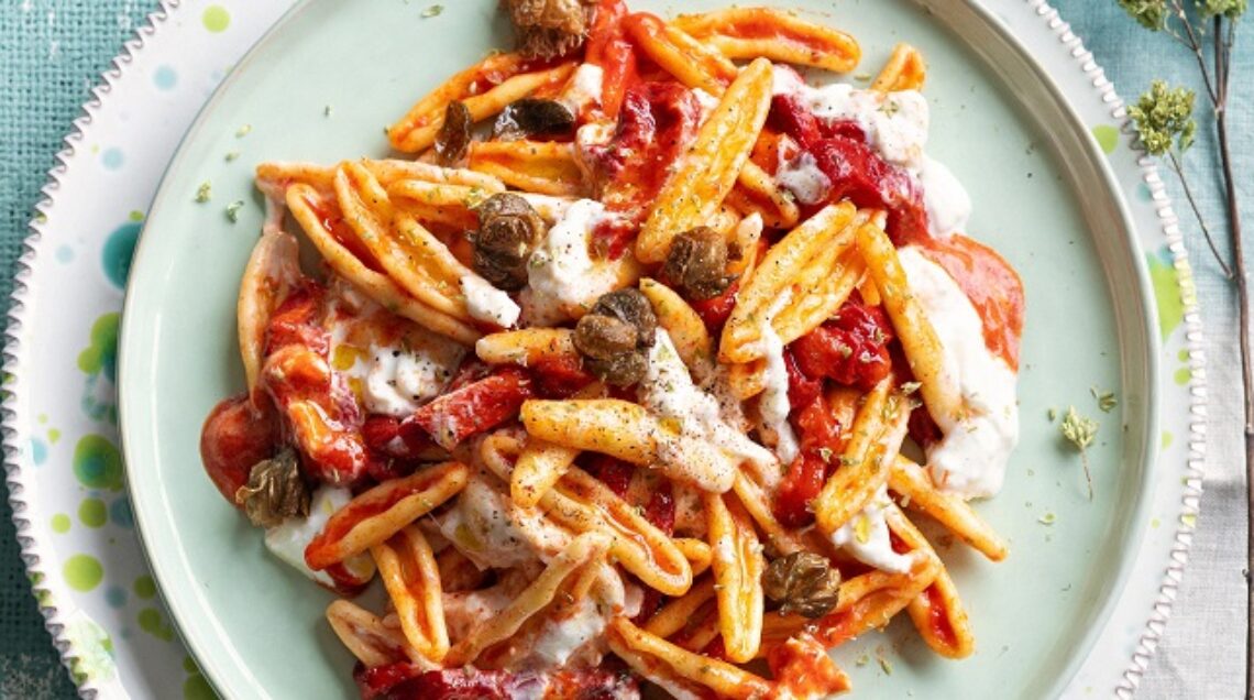 5 Nel frattempo cuocete la pasta in acqua salata, scolatela al dente e conditela in una terrina riscaldata con la salsa di peperoni e i peperoni a striscioline. Mescolate bene, completate con la stracciatella e i capperi e servite.