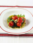 1) Prepara gli ingredienti. Lava i pomodori, elimina i piccioli e tagliali in 4 nel senso della lunghezza. Rimuovi i semi, rovescia i pomodori in uno scolapasta e falli scolare qualche minuto su carta assorbente per eliminare l'acqua di vegetazione. Lava e pulisci i cipollotti. Privali della radice, delle foglie esterne più dure e di circa metà della parte verde; quindi tagliali a rondelle sottilissime. Lava le foglie di basilico, sovrapponile e tagliale a listarelle abbastanza sottili o spezzettale grossolanamente con le mani.