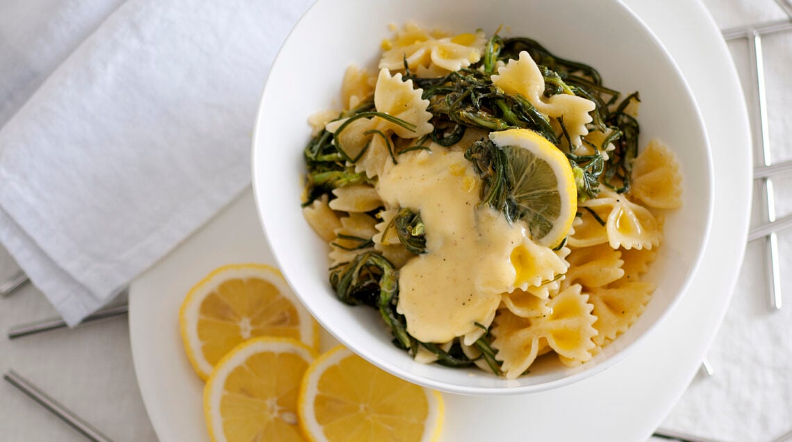 2) Metti una casseruola a bagnomaria e sbattici, con l’aiuto di una frusta, i tuorli con 4 cucchiai di succo di limone e 10 cucchiai di acqua fredda. Continuando a sbattere incorpora poco alla volta 80 g di burro tagliato a tocchetti. Monta la salsa che accompagnerà le farfalle finché non risulterà densa e cremosa. Fai attenzione a non scaldarla troppo perché rischia di impazzire. Regola di sale e pepe e tienila in caldo, mescolandola spesso.