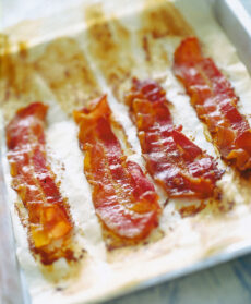 Mentre la pescatrice cuoce, taglia il bacon in strisce sottili e uniformi, adagiale su di una placca da forno foderata con carta oleata e croccale al grill fino a renderle dorate. Elimina il grasso in eccesso con la carta assorbente.