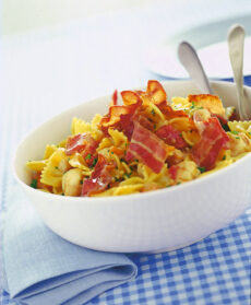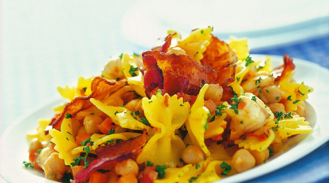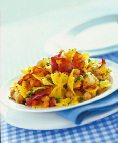 Aromatizza con il prezzemolo tritato, aggiungi il bacon e infine servi le farfalle con ragù di ceci, pescatrice e bacon ben calde.