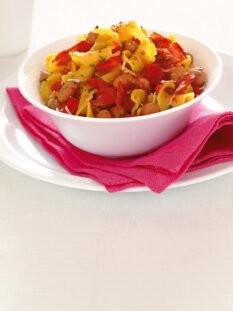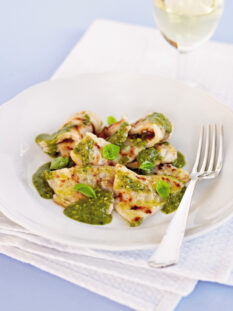 Le farfalline al pesto di sedano con scalogni, prosciutto cotto e olive verdi