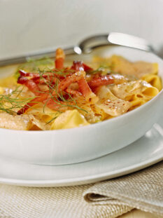 La pasta con pancetta tostata in guazzetto di pomodoro