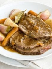 2) Scalda il fondo di cottura della carne con la panna. Elimina l’aglio e il rametto di erbe e aggiungi, se necessario, sale e pepe.