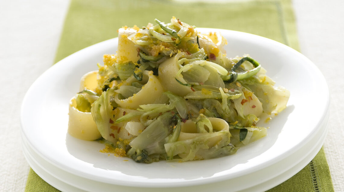 4 Sgocciolate la pasta, conditela con le puntarelle, distribuitela nei piatti, cospargetela con la bottarga rimasta e servite subito.