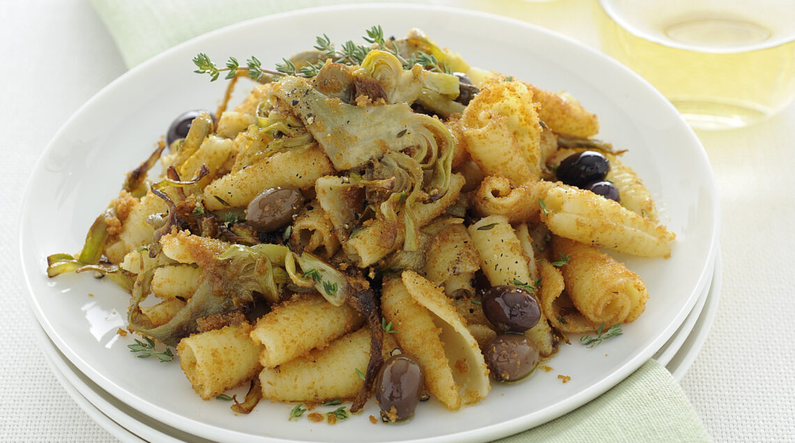 3) Scola la pasta al dente e condiscila con i carciofi e le olive taggiasche. Servi le castellane con le olive con una spolverata di pane tostato.