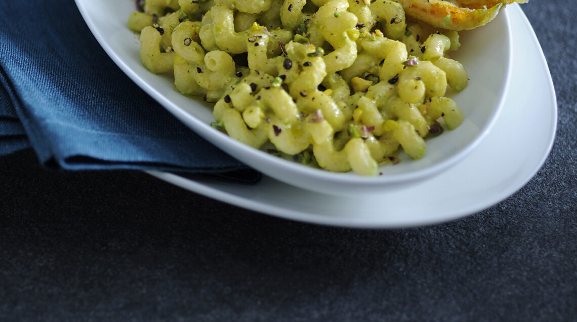 2) Scola i cellentani e condiscili con la crema di fave. 3) Servi i cellentani con crema di fave nei piatti individuali con una guarnizione composta dai rimanenti pistacchi tritati, dai grani di pepe nero pestati e dai fiori di zucca fritti.