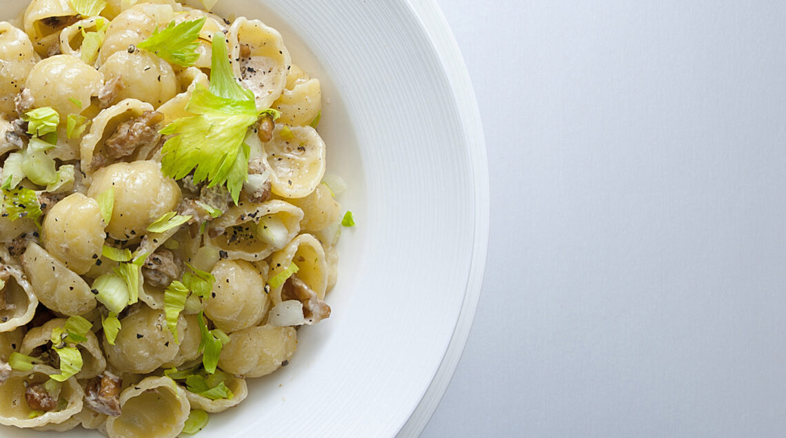 Una preparazione semplice e rapida, nella quale un condimento cremoso di noci, sedano e robiola profumato al Gin avvolge le conchiglie