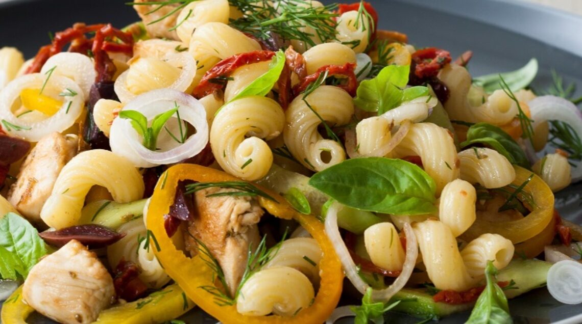 4 Mondate e affettate ad anelli il peperone e il cipollotto, tagliate a tronchetti il cetriolo e spezzettate le olive. Mescolate le verdure e leolive con i pomodori secchi, le foglie del basilico e dell'aneto, il succo del limone rimasto, 2 cucchiai d'olio e una presa di sale. Aggiungete il pollo e la pasta, mescolate bene e servite.