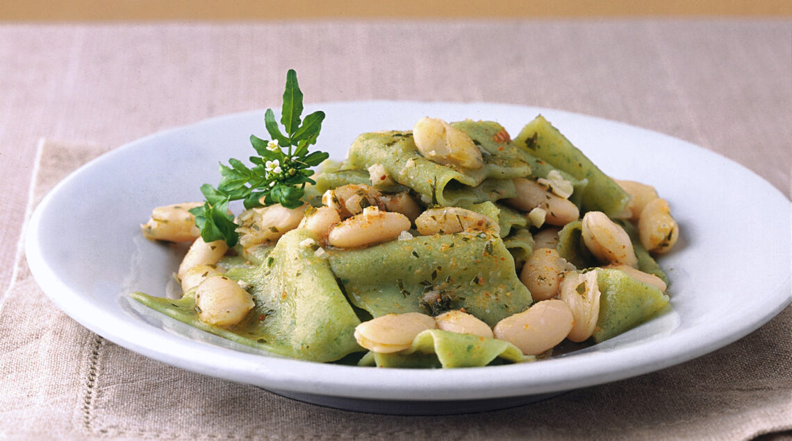 3 Lessate le lasagnette al dente in abbondante acqua salata, scolatele, conditele con il sugo ai cannellini e servitele subito.