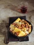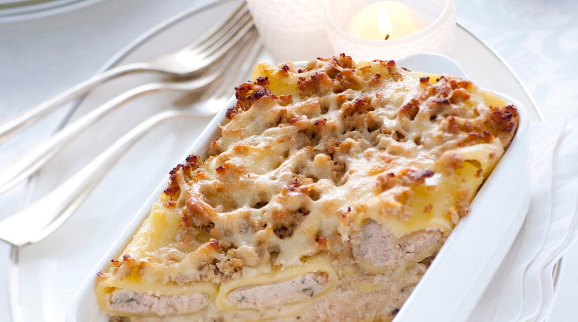 4) Sistemane uno strato in una pirofila imburrata, ricoprili con un po' di ragù, panna ed emmentaler grattugiato; ripeti gli strati fino a esaurire gli ingredienti, terminando con ragù, formaggio e fiocchetti di burro.