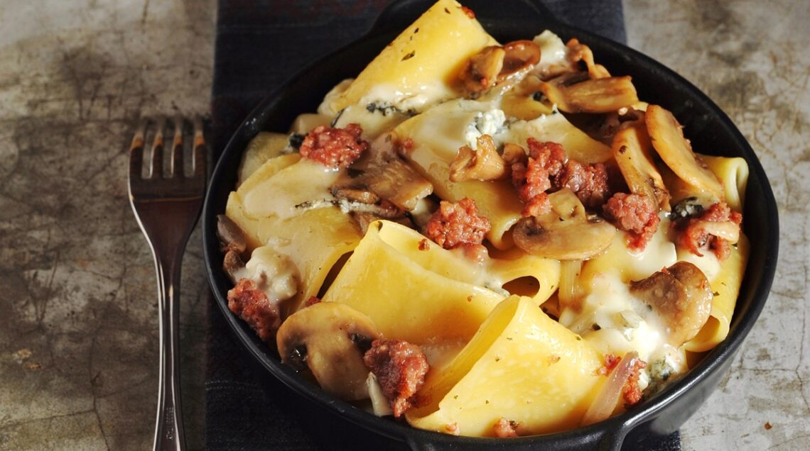 2 Unite la salsiccia, spellata e sbriciolata, e lasciatela insaporire per qualche minuto. Aggiungete i funghi, regolate di sale e continuate la cottura per 10-15 minuti.
