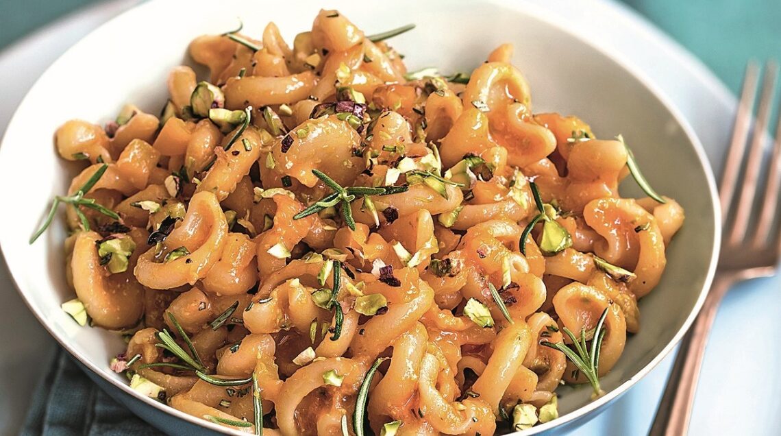 3 Cuocete i vesuvi, o un altro formato di pasta, in abbondante acqua salata, scolateli al dente e condite con il pesto, ammorbidito se occorre con qualche cucchiaio di acqua di cottura della pasta. Completate con i pistacchi rimasti, tritati grossolanamente, le foglie di rosmarino e un filo d'olio crudo.