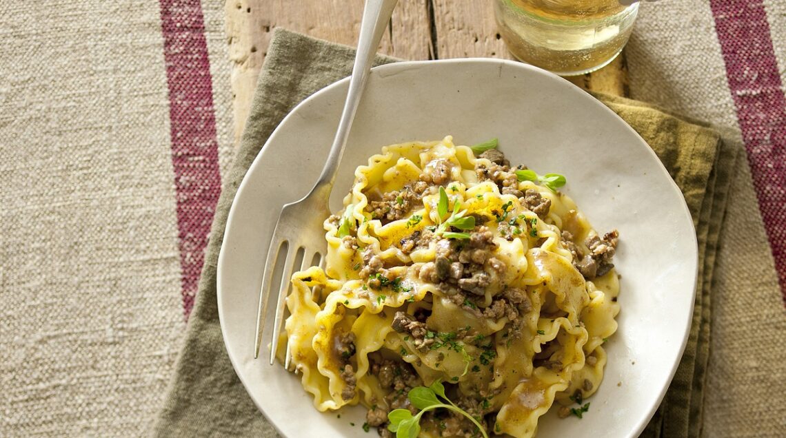 Un ragù facile, economico, dal sapore verace. Preparato con fegatini di pollo, capperi e acciughe si insinua a meraviglia tra i bordi ondulati delle mafalde
