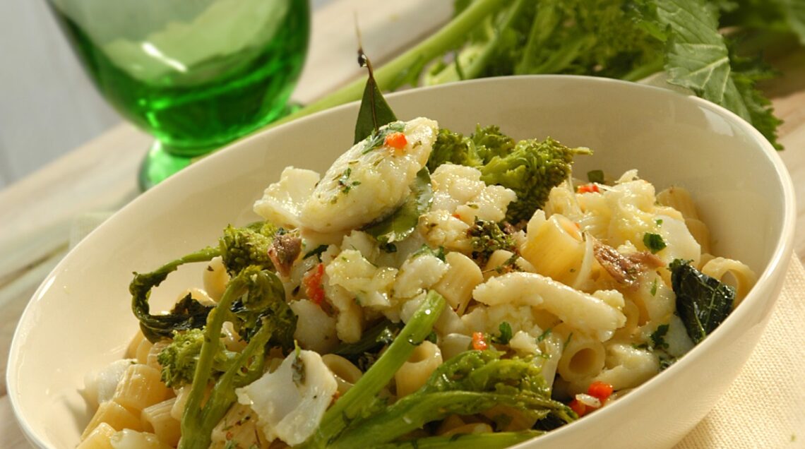 Con una punta di peperoncino e una presa di origano, i tubetti sono protagonisti di un primo gustoso e rustico che abbina un pesce sapido come il baccalà alle cime di rapa, gradevolmente amarognole.