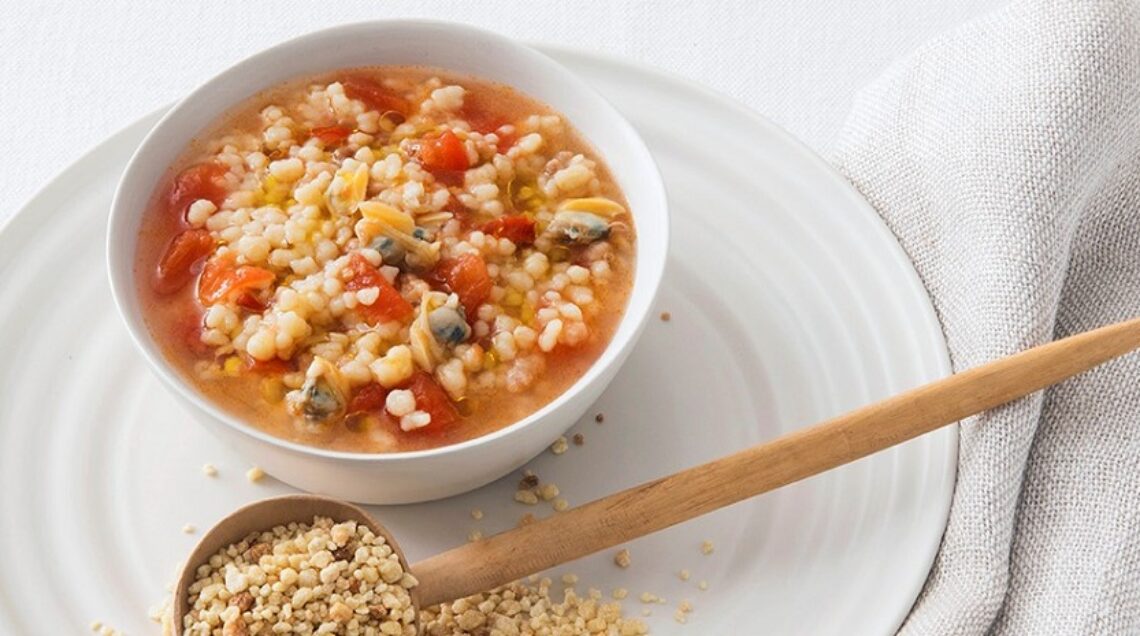 3) Quando la fregola è al dente, unite il condimento di pomodoro e vongole, mescolate, togliete dal fuoco e servite.