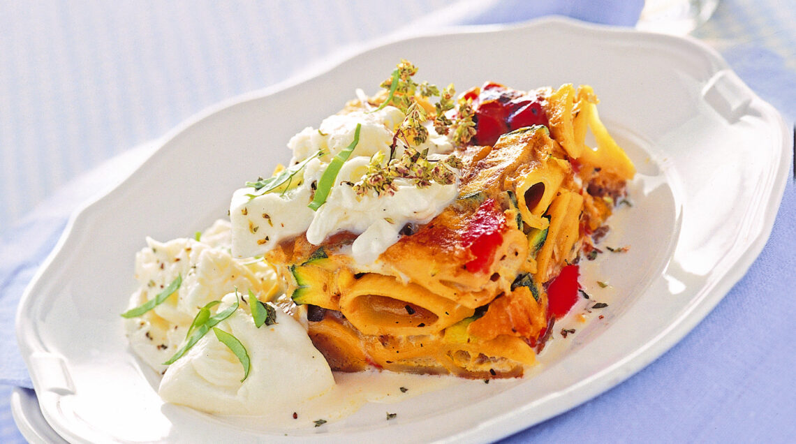 Frittata di pasta con verdure grigliate e burrata