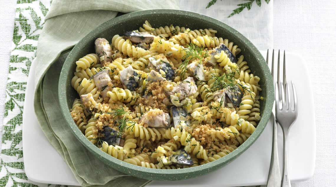 Un primo piatto dai sentori mediterranei, con pesce azzurro, profumi selvatici e il pangrattato al posto del formaggio