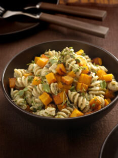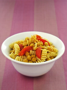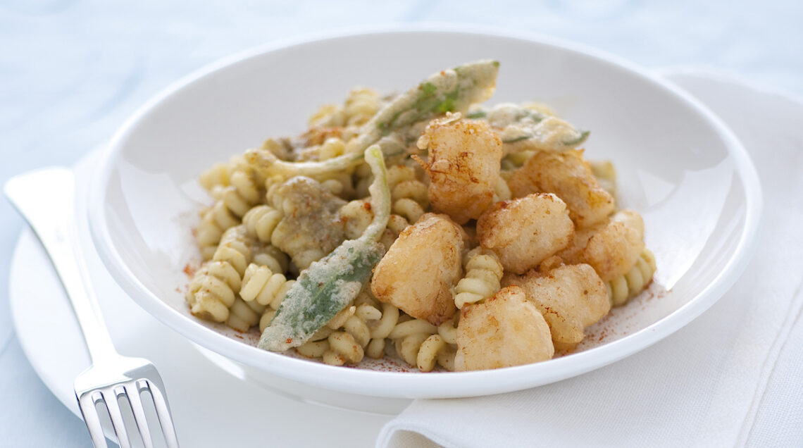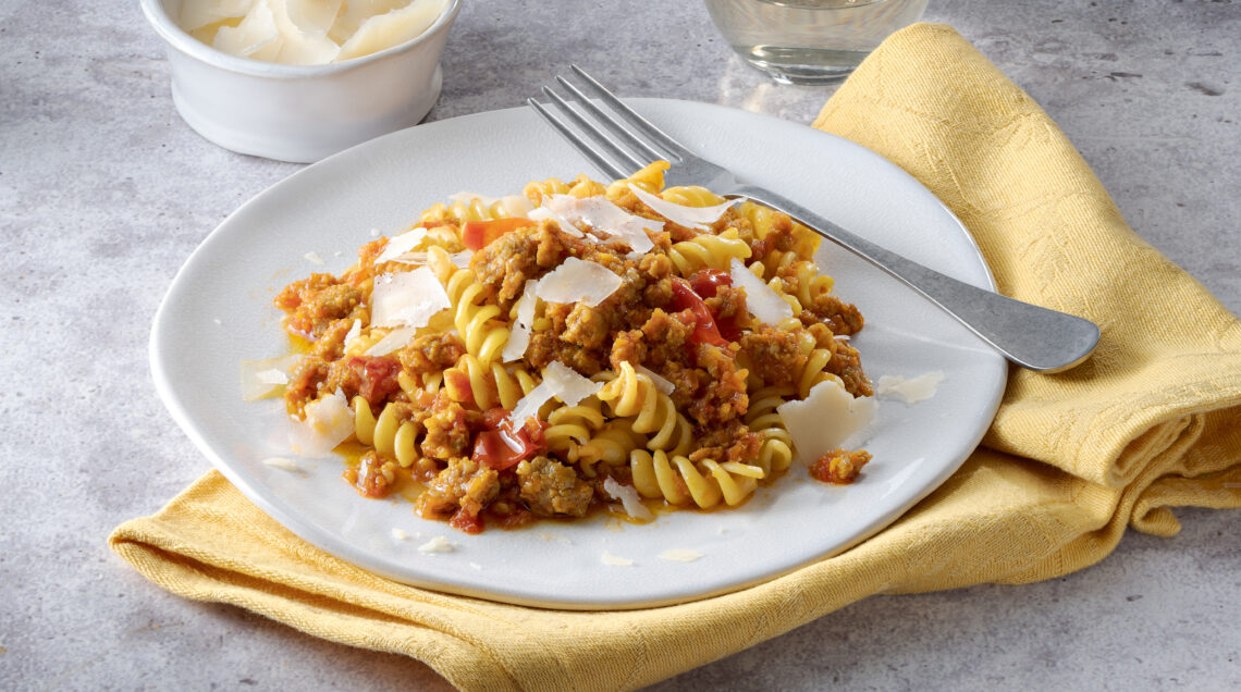 Fusilli con crema di robiola, sugo di peperoni e briciole di pane