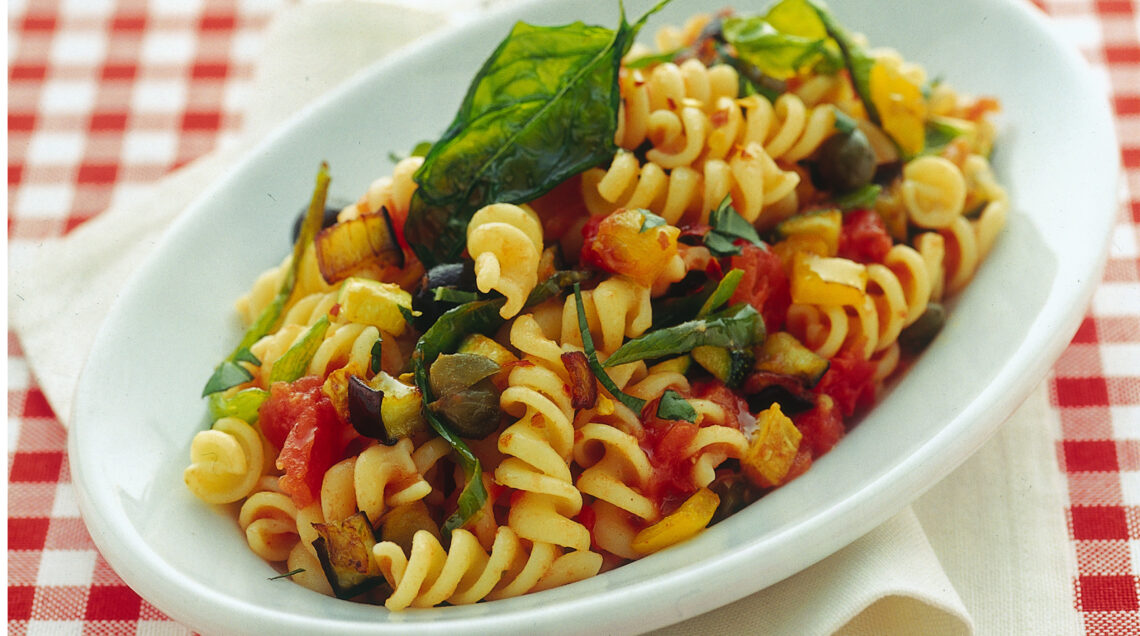 3) Metti a cuocere i fusilli in abbondante acqua salata, scolali e raffreddali sotto l’acqua corrente prima di condirli con il sugo. Dopo aver lasciato riposare la pasta già condita per circa un’ora, servila con qualche foglia di basilico spezzettato.