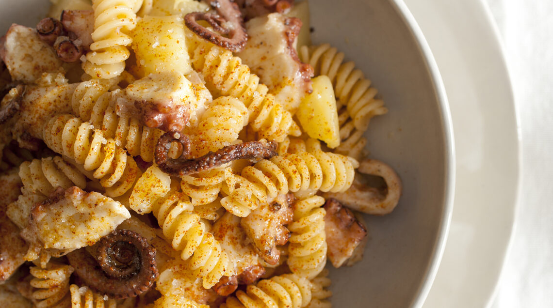 3) Procedi pelando e tagliando le patate a dadini, poi aggiungi al brodo di cottura del polpo la giusta quantità di acqua per cuocere la pasta. A questo punto porta a ebollizione, getta i fusilli insieme ai dadini di patate e, una volta pronti, versali direttamente nel tegame contenente il polpo e mescola bene. Ora puoi servire la pasta con le patate e il polpo alla gallega.
