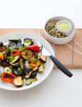 1 Pulite le zucchine e i cipollotti, tagliateli a fette per il lungo e grigliateli. Pelate i peperoni ed eliminate i semi. Sciacquate la feta, asciugatela e sbriciolatela.