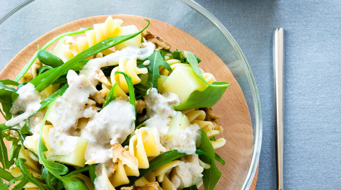 3) Nel mentre che porti a ebollizione l’acqua salata, spunta i fagioli e tagliali a metà per il senso della lunghezza, poi mettili a cuocere con la pasta. Scola il tutto e conserva qualche cucchiaio di acqua di cottura che ti servirà per diluire la salsa alle noci. Infine condisci i fusilloni con i dadi di patate, la rucola, le noci rimaste e un filo d’olio, poi impiatta e servi a parte la salsa cremosa di noci.