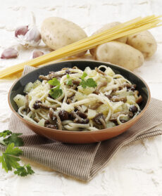 3) Lava le patate e lessale per 10 minuti in una casseruola con acqua già bollente, sbucciale, tagliale a cubetti e uniscile ai chiodini in padella.