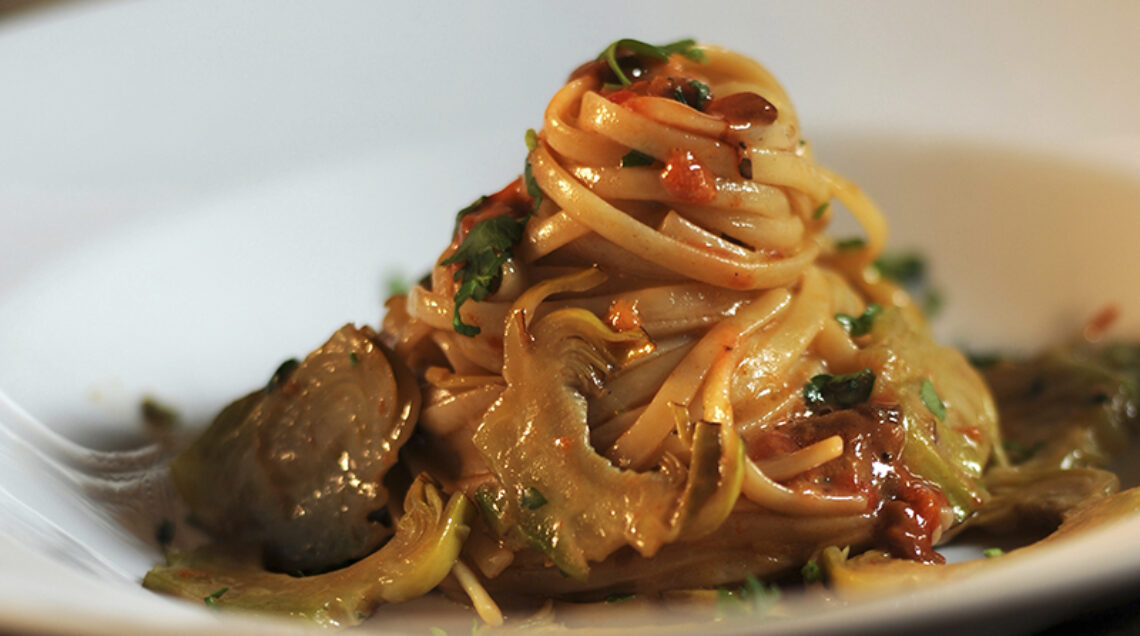 Le linguine condite con i carciofi rosolati e i ricci di mare diventano superbe nella dualità del condimento. Il profumo di aglio e prezzemolo rende il piatto verace, ma gentile