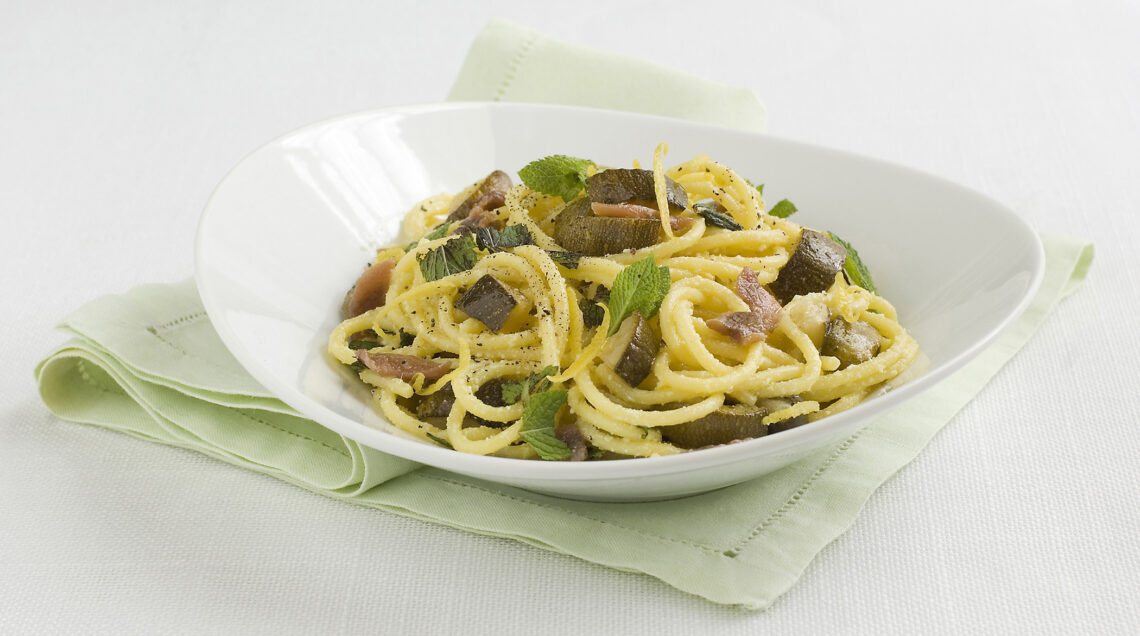 1) Comincia a preparare la pasta alle zucchine arrostite con acciughe e menta cuocendo 320 grammi di linguine in abbondante acqua bollente salata. Nel frattempo sgocciola le zucchine e i filetti di acciuga.
