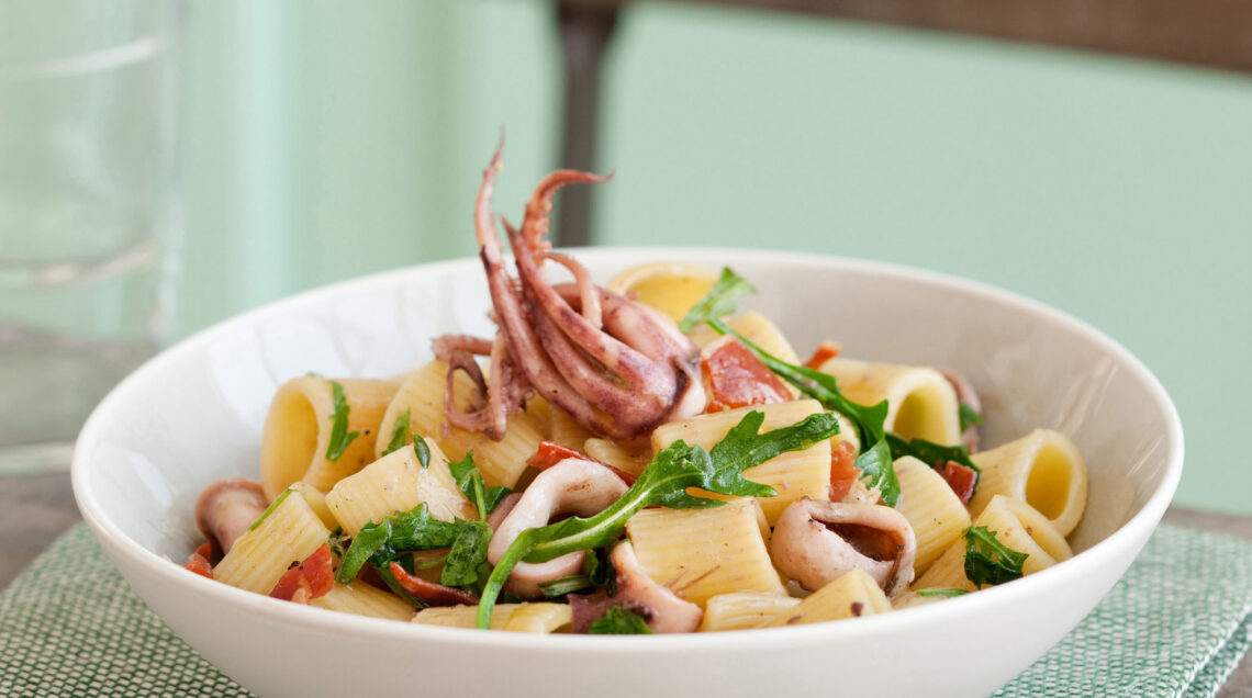 3) Cuoci la pasta in acqua bollente salata, scolatela e rovesciala nel tegame con il pesce: unisci la rucola spezzettata, mescola bene e servi.