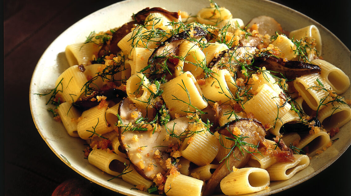 4) Cuoci e servi le mezze maniche. Lessa la pasta in abbondante acqua bollente salata, scolala al dente e condiscila con il sugo di funghi. Distribuiscila nei piatti, cospargi con la mollica fritta e servi le mezze maniche con porcini, mollica e finocchietto.