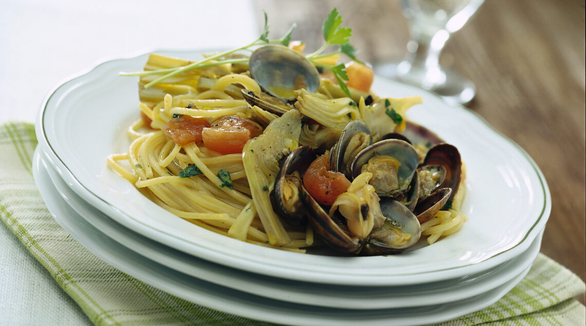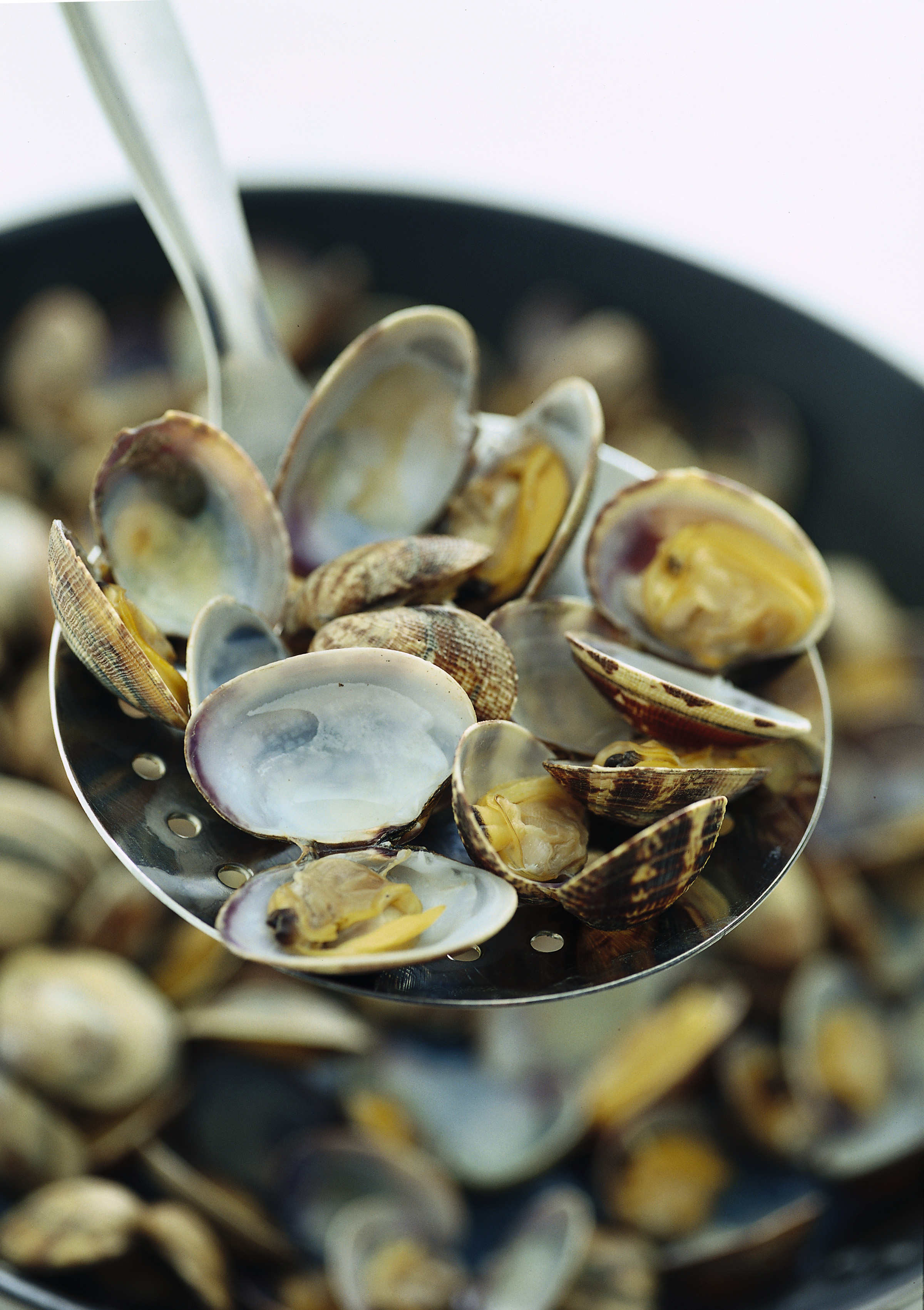 3) Fai aprire le vongole in un largo tegame coperto a fuoco vivace, estraile con un mestolo forato e filtra il liquido di cottura.