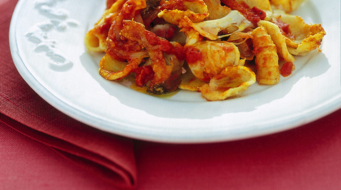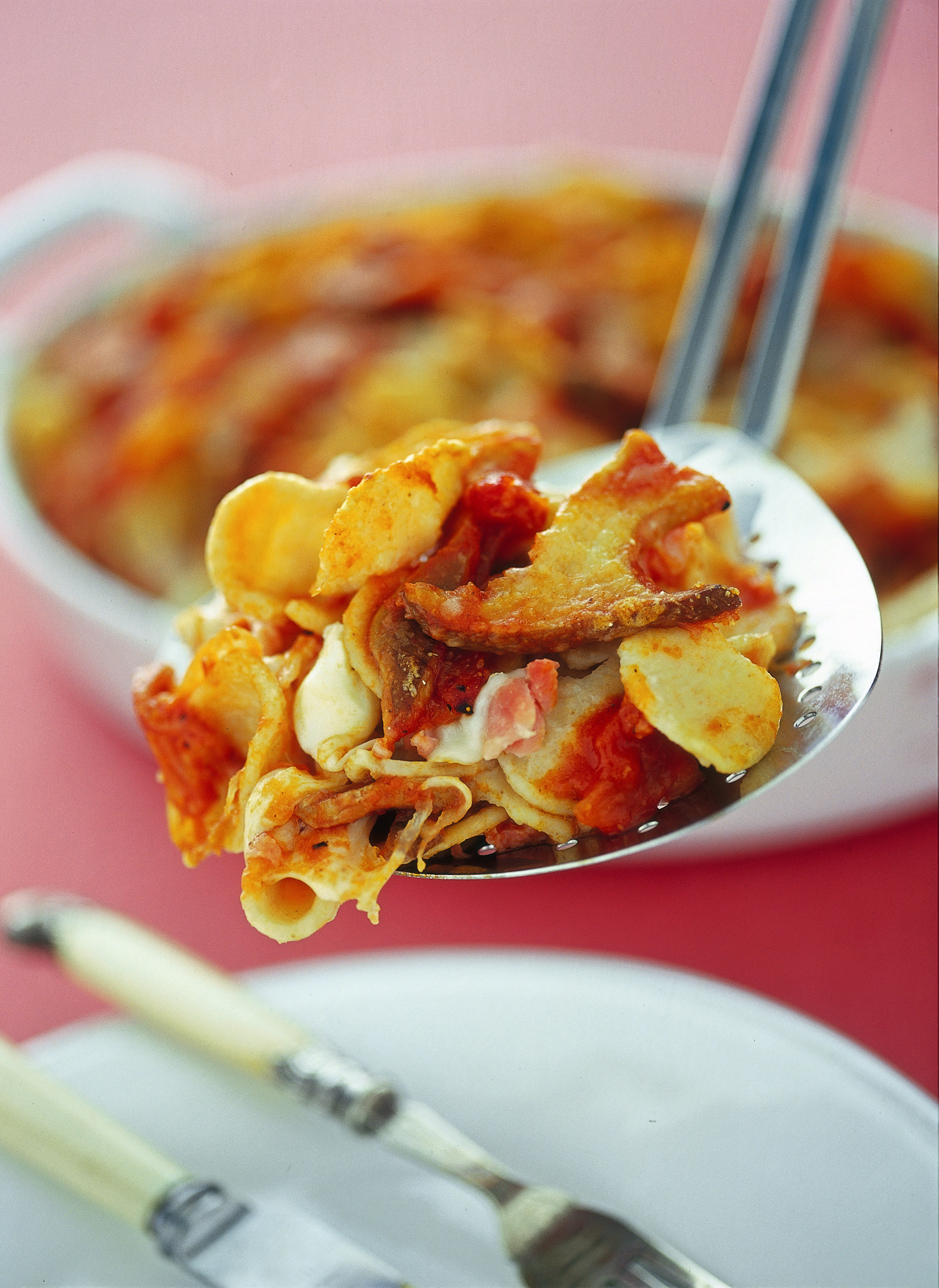 Un primo piatto autunnale verace, preparato con pregiati funghi, salumi, mozzarella e sugo di pomodoro