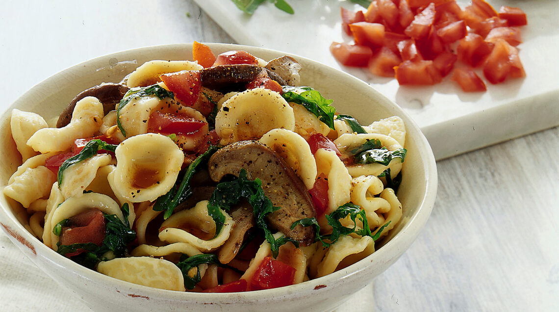 3) Completa e servi le orecchiette con porcini, rucola e pomodorini. Porta a ebollizione abbondante acqua salata, unisci le orecchiette e la rucola, fai riprendere l'ebollizione e porta a cottura. Scola infine la pasta e la verdura, condisci subito con il sugo di funghi porcini e la dadolata di pomodoro e servi.