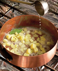 Mettete le vongole in una padella e fatele aprire a fuoco vivo. Scolatele e filtrate la loro acqua. Soffriggete in un tegame lo scalogno con una foglia di alloro e 3 cucchiai di olio, unite le patate a pezzetti e rosolatele; bagnatele con un mestolino di fumetto e cuocetele unendo man mano altro fumetto.