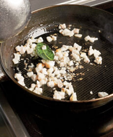 Scaldate 2 cucchiai di olio con una foglia di alloro in una padella antiaderente, unite i dadini di pesce, rosolateli velocemente, salateli e pepateli.