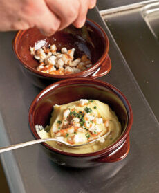 Mescolate i dadini di pesce a una parte della crema di patate e insaporite con un trito di prezzemolo e un cucchiaio di "petali" di pomodori tagliati a pezzettini.