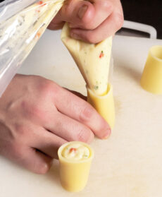 Un primo piatto di pasta gourmand a base di pecse, nella farcitura e nel condimento. Un guazzetto superbo con una salsina che profuma di porto