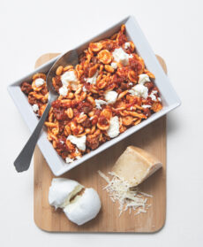 Triplo formato di pasta per un ricco sugo dal sapore verace, con salsiccia e mozzarella