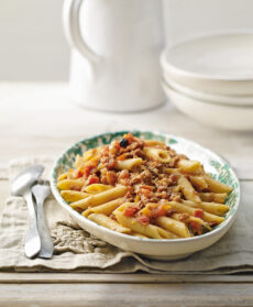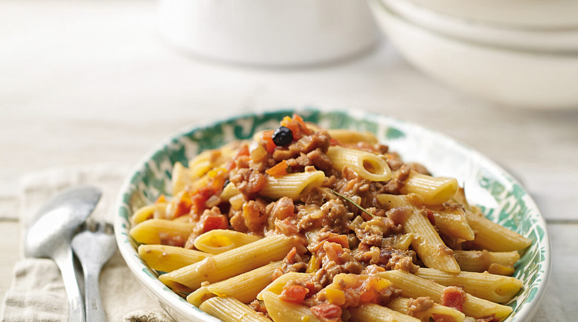 Cuoci le pennette in acqua bollente salata, scolale e condiscile con il ragù di seitan e un cucchiaio di panna di soia.