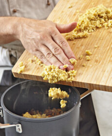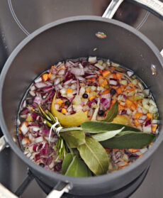 Prepara un trito con il sedano, la carota, la cipolla, l’aglio, la salvia, il rosmarino e la scorza di limone; unisci qualche bacca di ginepro e rosola in olio d’oliva.