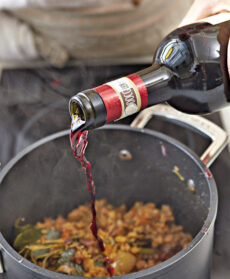 Aggiungi salsa shoyu, bagna con il vino rosso e lascia evaporare, unisci i pomodori, regola di sale e pepa.