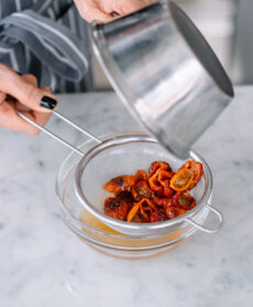 Ammorbidite i pomodorini secchi in acqua calda per 10 minuti, quindi scolateli mantenendo un po' di acqua.