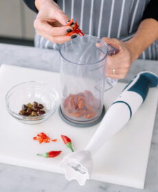 Metteteli nel bicchierone del frullatore, unite le olive e i peperoncini e frullate fino a ottenere una salsina.