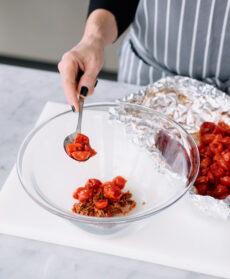 Versate in una ciotola la salsina di pomodori secchi e mescolatevi i pomodori cotti, eliminando l'aglio.
